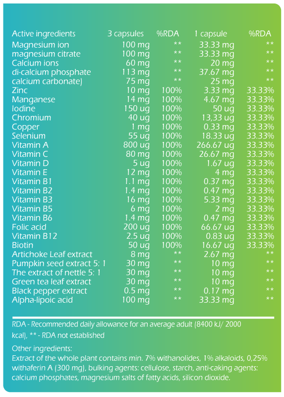 Multi vitamin dietary supplement is an advanced High-Potency vitamins and Minerals complex consisting of 28 vitamins & minerals to support Performance and Well Being also to keep your immunity system at always higher levels.